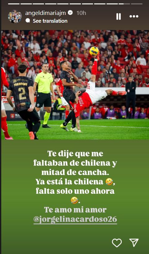 «Disse-te que me faltava um golo de bicicleta e um do meio-campo. A bicicleta já está, falta o do meio-campo. Amo-te meu amor», escreveu Di María, em jeito de brincadeira, numa mensagem dedicada à companheira Jorgelina Cardoso no Instagram.