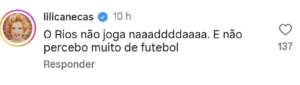 Sem meias-palavras, Lili Caneças escreveu que Richard Ríos “não joga nada”, uma afirmação que rapidamente ganhou destaque e começou a circular entre os adeptos. O comentário tornou-se viral e gerou uma avalanche de reações, sobretudo entre os benfiquistas.