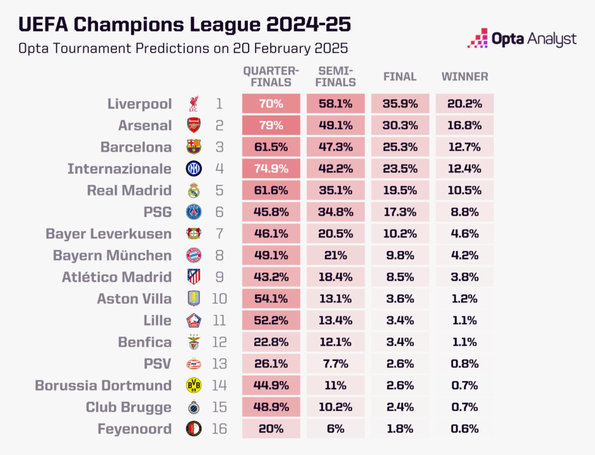 Para responder a estas questões, o supercomputador Opta simulou 10 mil vezes o resto da prova milionária para analisar a probabilidade de cada equipa chegar a cada fase da competição, bem como projetar um potencial vencedor.