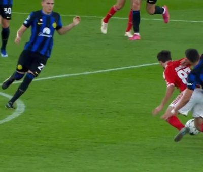 Os adeptos e jogadores do Benfica queixam-se da grande penalidade marcada ao Inter, uma vez que houve uma falta no início do lance sobre João Neves.